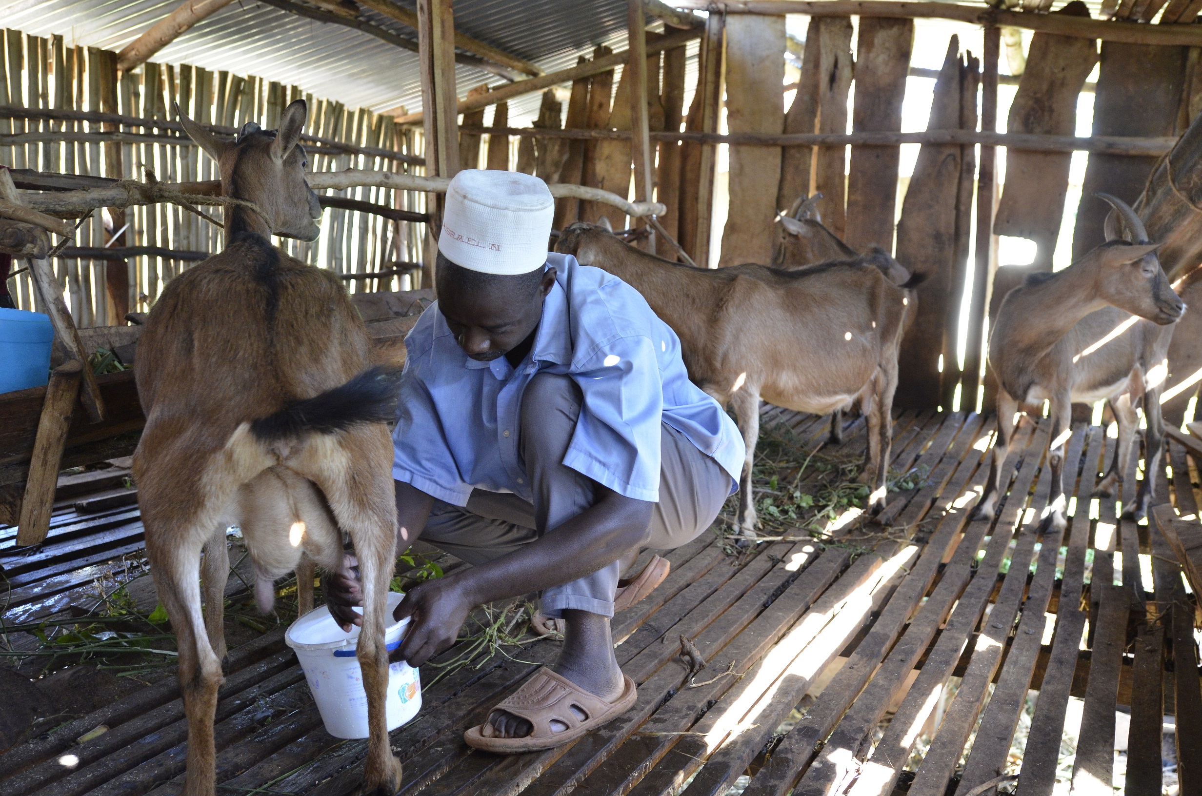 Ein kenianischer Milchziegenzüchter beim Melken. Foto: Dirk Ostermeier, GIZ