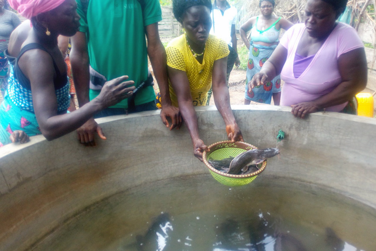 Traditionell werden Schnecken in Feuchtgebieten im Busch gesammelt und Welse in Flüssen und Teichen gefangen. Diese Arten sind widerstandsfähig. Forscher und Produzenten haben gelernt, wie man sie domestizieren kann, und es stehen einfache Haltungsmethoden zur Verfügung. Die produzierten Mengen an Schnecken und Fisch lassen sich leicht absetzen, so dass die Kosten durch den Verkaufserlös gedeckt sind. Ein Teil der Produktion dient jedoch der Ernährung der eigenen Familie.