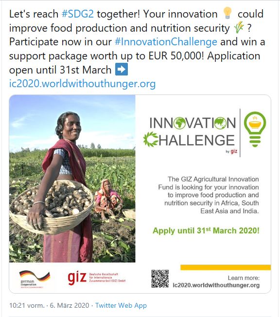 The Agricultural Innovation Fund was looking for innovations from small enterprises, start-ups and smallholder organisations from GIZ partner countries that have the potential to make agriculture more efficient and sustainable along the entire value chain. The overall objective is to contribute to the fight against hunger and malnutrition and thus to the achievement of the second sustainability goal of the United Nations until 2030.