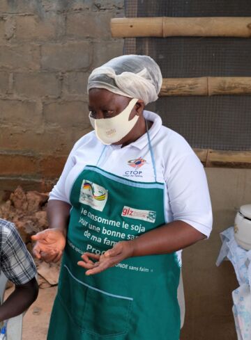 She learned how to make all these products in several training courses at the Green Innovation Centre – a GIZ project as part of the One World – No Hunger initiative. They also dealt about baby food – because soy flour serves as an excellent basis for this. Tata Bi now packs this mixed with other vitamin-rich cereals such as millet into bags and sells them. Tata Bi develops the new products together with the four women and two men who now work for and with her: But that is not all: the entrepreneur conducts training courses and imparts her knowledge to other women via local radio. In addition to the clay oven, a small soy training centre with a focus on entrepreneurship and processing has been established in her backyard. Tata Bi invests part of her income in her growing business – for example, in a washing station in the early 2020s to maintain hygiene standards.