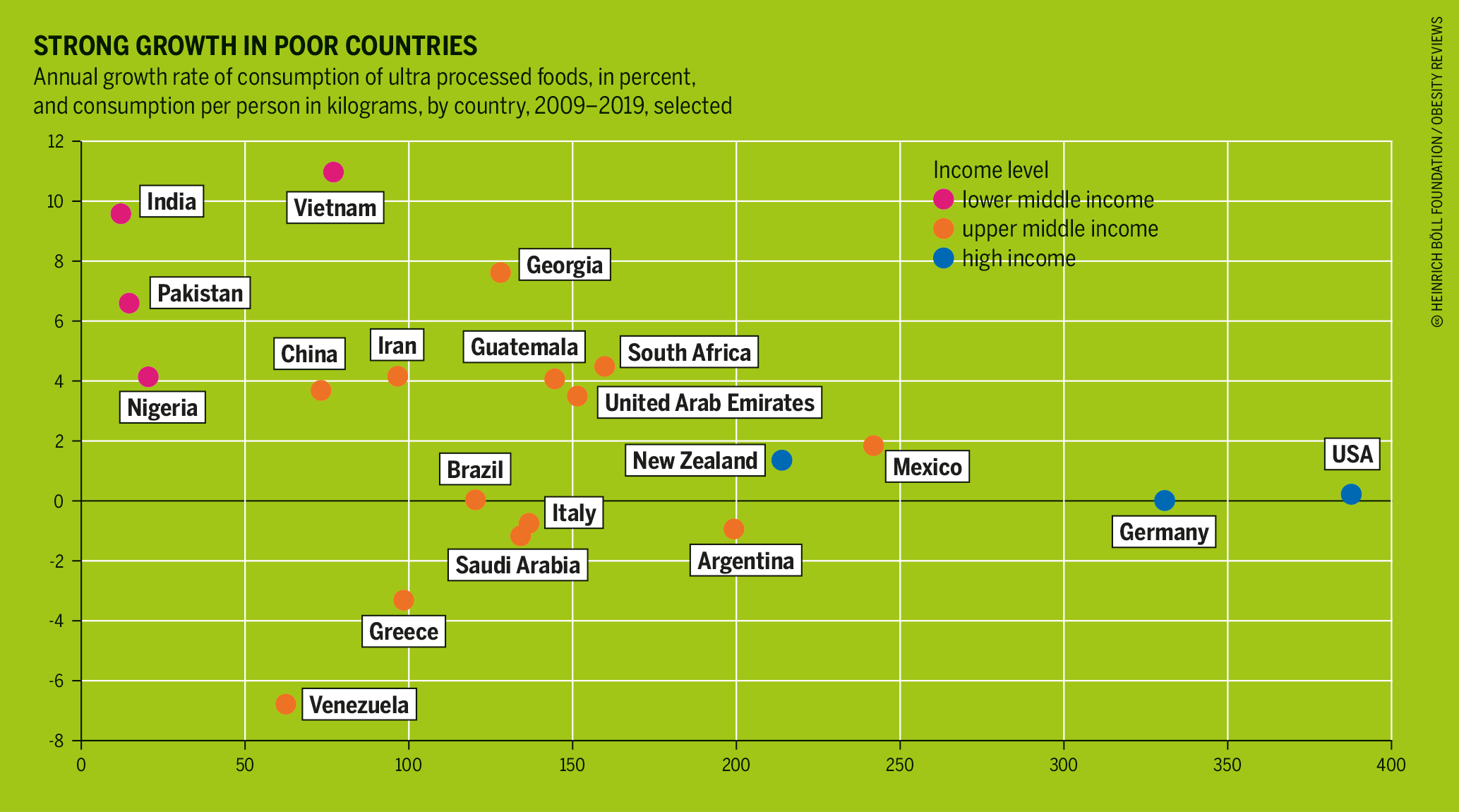 The consumption of ultra-processed foods has come into focus as a cause of obesity. Such foods include sweetened drinks, snacks and frozen meals. They have a high calorie density and often contain cheap ingredients such as palm oil, sugar and starch. They have become part of the food system all over the world. Compared to other foods, ultra-processed items have a longer shelf-life, are more often ready to eat, and are more heavily marketed.