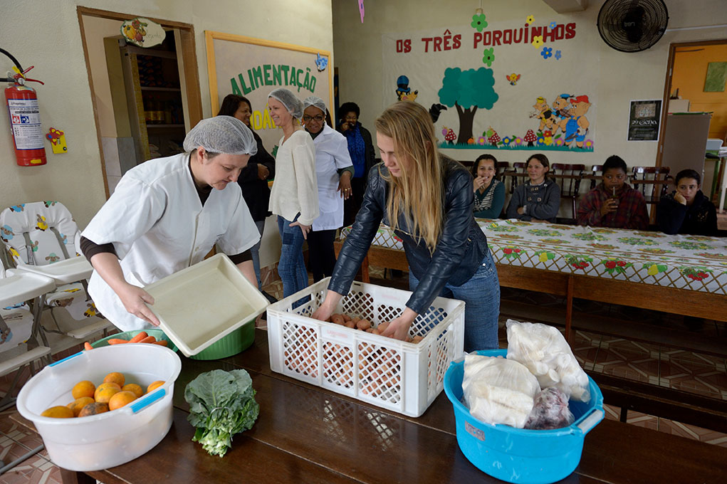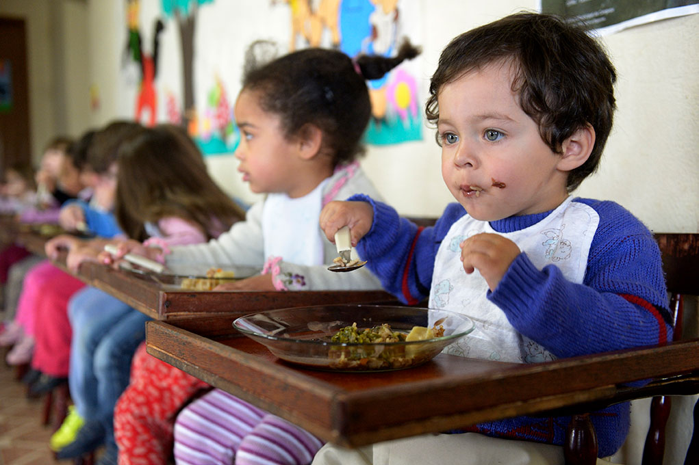 „Hallo Tomate!“, sagt die grüne Handpuppe. „Hallo Apfel!“, entgegnet die rote. Was dann folgt, ist eine laute, nicht immer ganz verständliche Unterhaltung zwischen den beiden Filzgestalten, denen der zweijährige Derick fantasievoll Leben verleiht. Ein paar Mädchen malen derweil Zeichenvorlagen aus und kichern über ihre rosa Äpfel und die Ananas in den Farben des Regenbogens. So lustig kann das Thema gesunde Ernährung sein. Zumindest wenn man so engagiert und einfallsreich ist, wie die Erzieherinnen im Kindergarten „Schneewittchen“ in der südbrasilianischen Kleinstadt Canguçu. Ein Klopfen an der Tür unterbricht das fröhliche Treiben. Die Mitglieder der Kooperative União sind wie jeden Dienstag gekommen und liefern ihre Waren frisch vom Feld für das Mittagessen an. Knackige Salate, Pfirsiche mit roten Bäckchen und frische Möhren werden in die Speisekammer getragen, wo Köchin Claudia Schiavon sie flink am richtigen Platz verstaut. „Sie sind immer frisch, haben mehr Nährstoffe und schmecken viel besser als das Zeug aus dem Supermarkt“, sagt Schiavon. „So lernen die Kinder von klein auf, sich gesund zu ernähren. Damit legen wir den Grundstein für ihr weiteres Leben.“