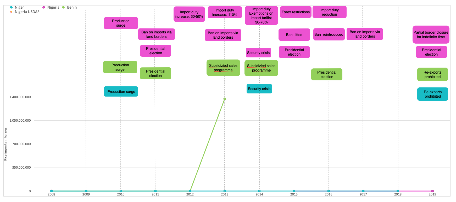 Politische Ereignisse auf regionaler und nationaler Ebene wirken sich in unterschiedlicher Weise auf Reisimporte und -produktion aus. Wie auch in anderen Regionen Afrikas reagierten die westafrikanischen Regierungen sofort auf die Lebensmittelpreiskrise von 2008, indem sie die Zölle auf importierten Reis und andere Getreidearten senkten. Diese Senkung der Importzölle ist jedoch mit hohen fiskalischen Kosten verbunden und zielt nicht auf die an den stärksten betroffenen Bevölkerungsgruppen ab - die Ärmsten sind nicht die größten Reisverbraucher, und die Händler geben die Kostensenkungen nicht in vollem Umfang an die Verbraucher weiter.